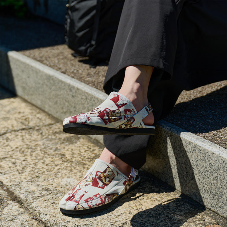 そめもようのお二人がつくりたいデザイン、理想とするクオリティを再現。甲の部分だけでなく側面もプリント可能エリアとし、全面に図案を入れた左右で一枚の画にしています。