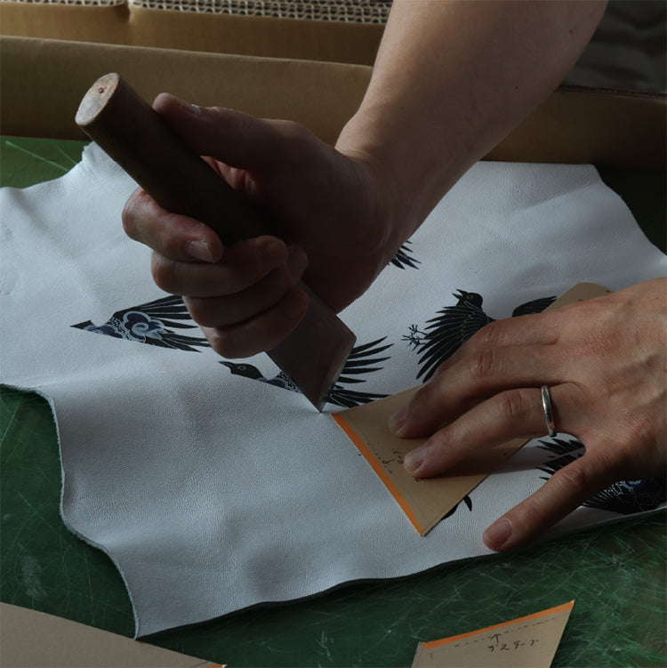 レザープリントは、YUSUKE TAGUCHI DESIGNの協力のもと、上質な革づくりと再現度の高いプリントレザーの技術をもつタンナーであるLEATHER LAB TOKYOで、友禅の繊細な柄を革に仕上げました。